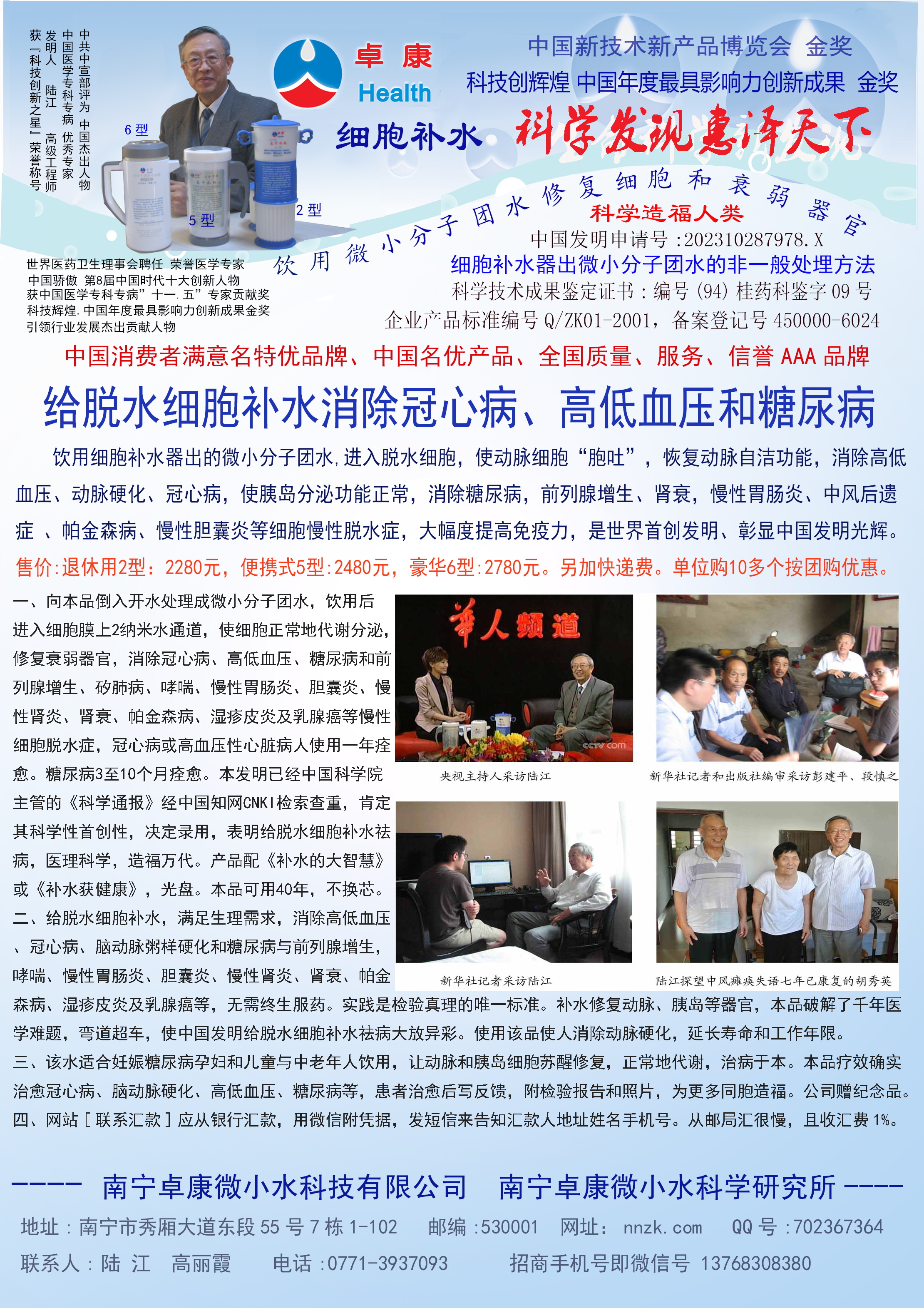 人類幾千年來患以上病癥需終生服藥,幾十年也不能治愈??墒俏覈蠈幍母呒壒こ處熽?nbsp;江,于1990年想根治高血壓,研究發明了離子水瓶,處理出微小分子團水供飲用,經過醫院臨床試用和專家鑒定,1999年獲中國發明專利權,產品于2000年投放市場后一直跟蹤調查,據全國各地用戶反饋:祛除了高低血壓、糖尿病和冠心病,并使前列腺增生、咽喉炎、鼻竇炎、慢性氣管炎、支氣管炎、矽肺病、哮喘、慢性胃炎、腸炎、慢性膽囊炎、慢性腎炎、腎衰、膀胱炎、便秘、痔瘡、風濕性關節炎和濕疹皮炎及中風后遺癥等病癥不藥而愈。為什么喝微小水能治20多種病?陸 江從1991年德國科學家發現細胞膜水通道僅為2納米獲得啟發,認為多種器官患病是因細胞脫水,不能正常代謝和分裂增殖,才使器官細胞減少致衰弱萎縮而形成細胞缺水性病癥。22年來的實踐有力地支持了“細胞脫水致病”這一重要論點,表明喝微小水可滿足細胞的生理需求,補水就能祛病,是生命科學新亮點。